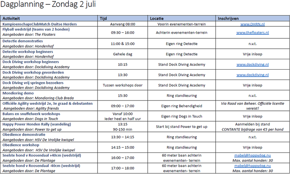 Hier vind je een overzicht van alles wat er te doen is tijdens het Hondenweekend 2023. Onderstaand zijn de dagplanningen te vinden. Er kunnen eventueel nog wat kleine aanpassingen worden gedaan.
